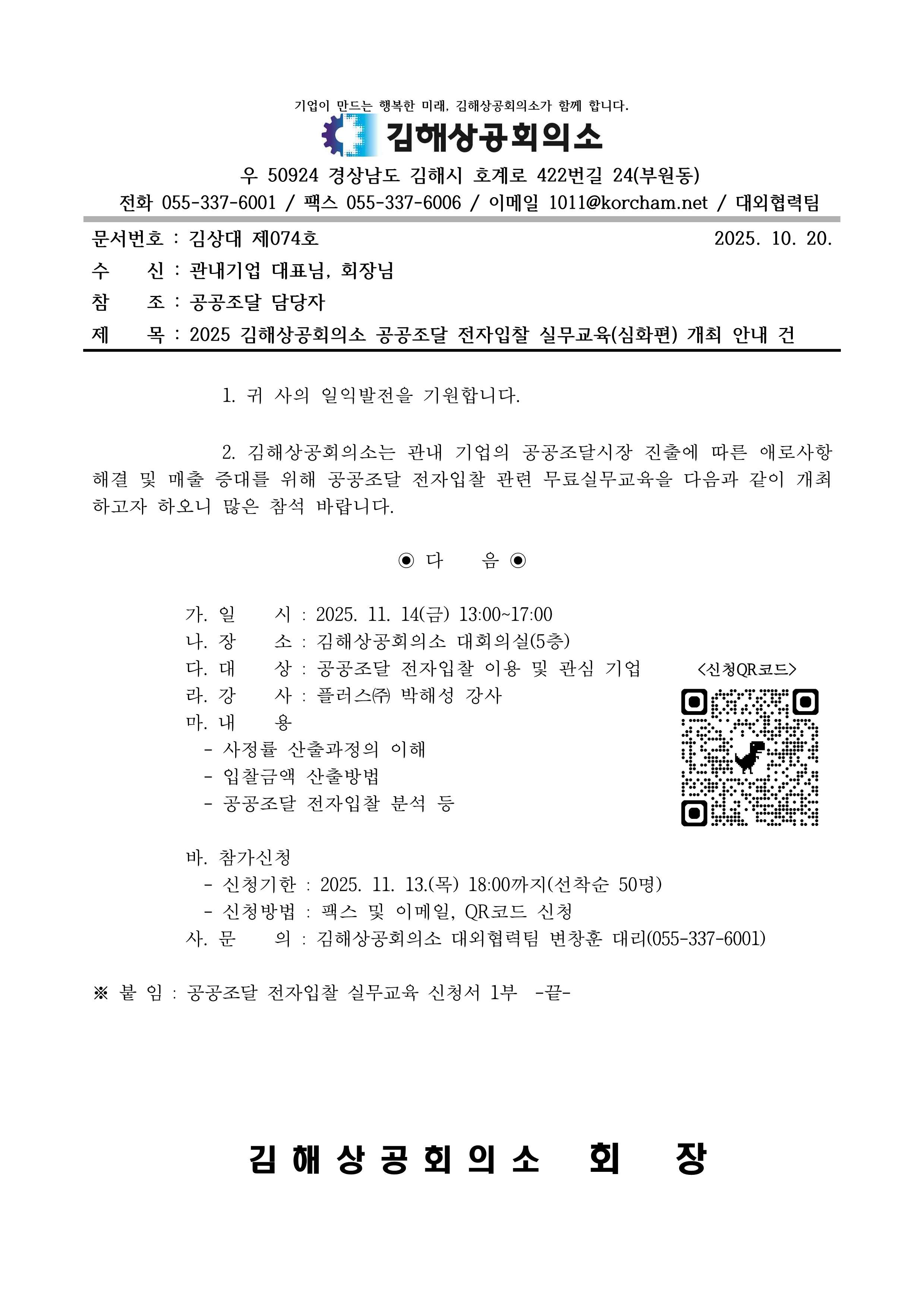 | ‒ | 2025 김해상공회의소 공공조달 전자입찰 실무교육(심화편) 개최 안내 건 |