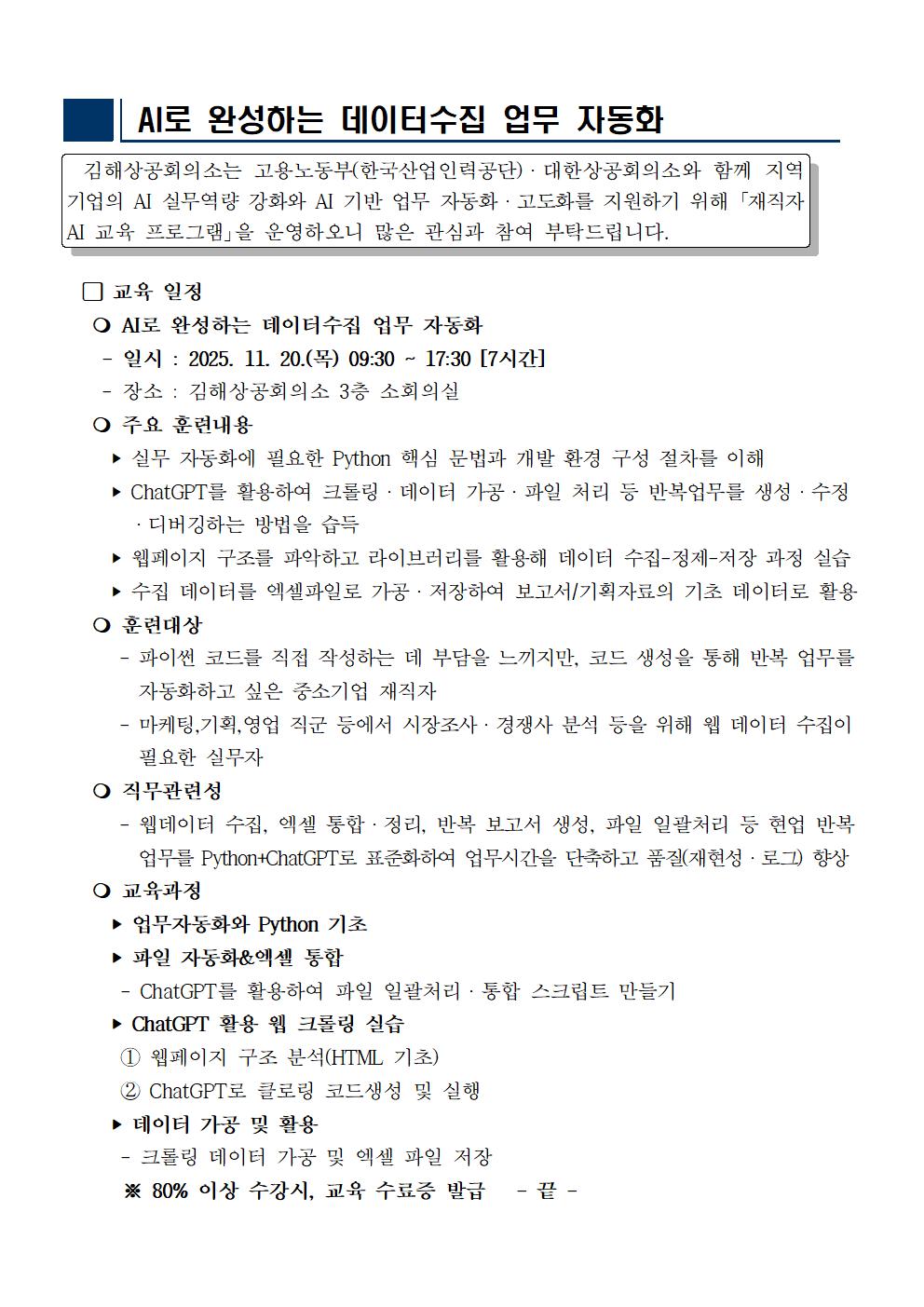 | 제목 | [재직자 AI교육] AI로 완성하는 데이터수집 업무 자동화 | ||