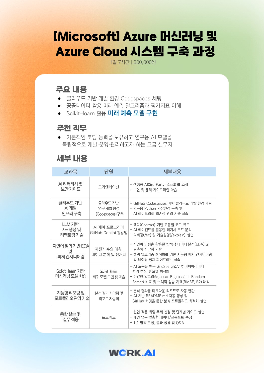 | 제목 | [재직자 AI교육] Azure 머신러닝 및 Azure Cloud 시스템 구축 과정 | ||