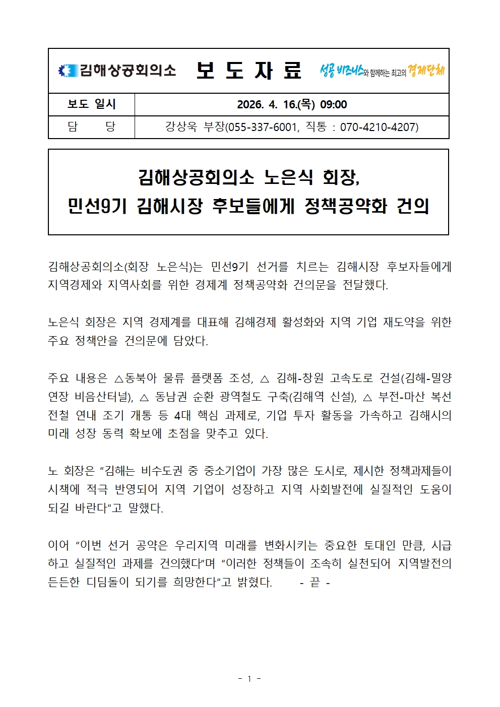 | ‒ | 김해상공회의소 노은식 회장, 민선9기 김해시장 후보들에게 정책공약화 건의 |